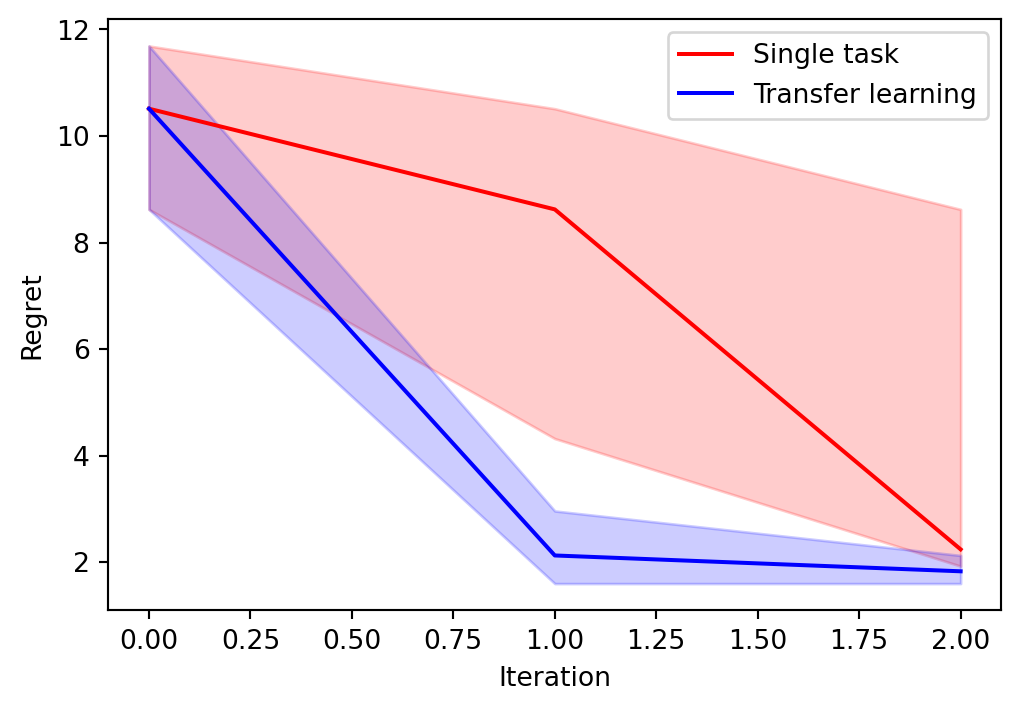 multitask_all_regrets.append(regrets_transfer_learning)Optimizing: 0%| | 0/2 [00:00<?, ?it/s]Optimizing: 0%| | 0/2 [00:02<?, ?it/s, Regret=1.6006]Optimizing: 50%|█████ | 1/2 [00:02<00:02, 2.28s/it, Regret=1.6006]Optimizing: 50%|█████ | 1/2 [00:04<00:02, 2.28s/it, Regret=1.6006]Optimizing: 100%|██████████| 2/2 [00:04<00:00, 2.01s/it, Regret=1.6006]Optimizing: 100%|██████████| 2/2 [00:04<00:00, 2.05s/it, Regret=1.6006]