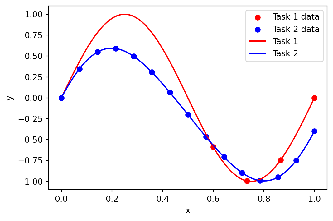 )import matplotlib.pyplot as pltIn this notebook we show how to use BoFire for the purposes of transfer learning Bayesian optimization. In particular, we assume we have a task \(f_2\) with data that is relevant to the optimization of our current task \(f_1\). The procedure is simple, we fit a MultiTask GP to both data-sets, however only carry out the BO on \(f_1\), i.e., we optimize the acquisition functions on on the task \(f_1\).