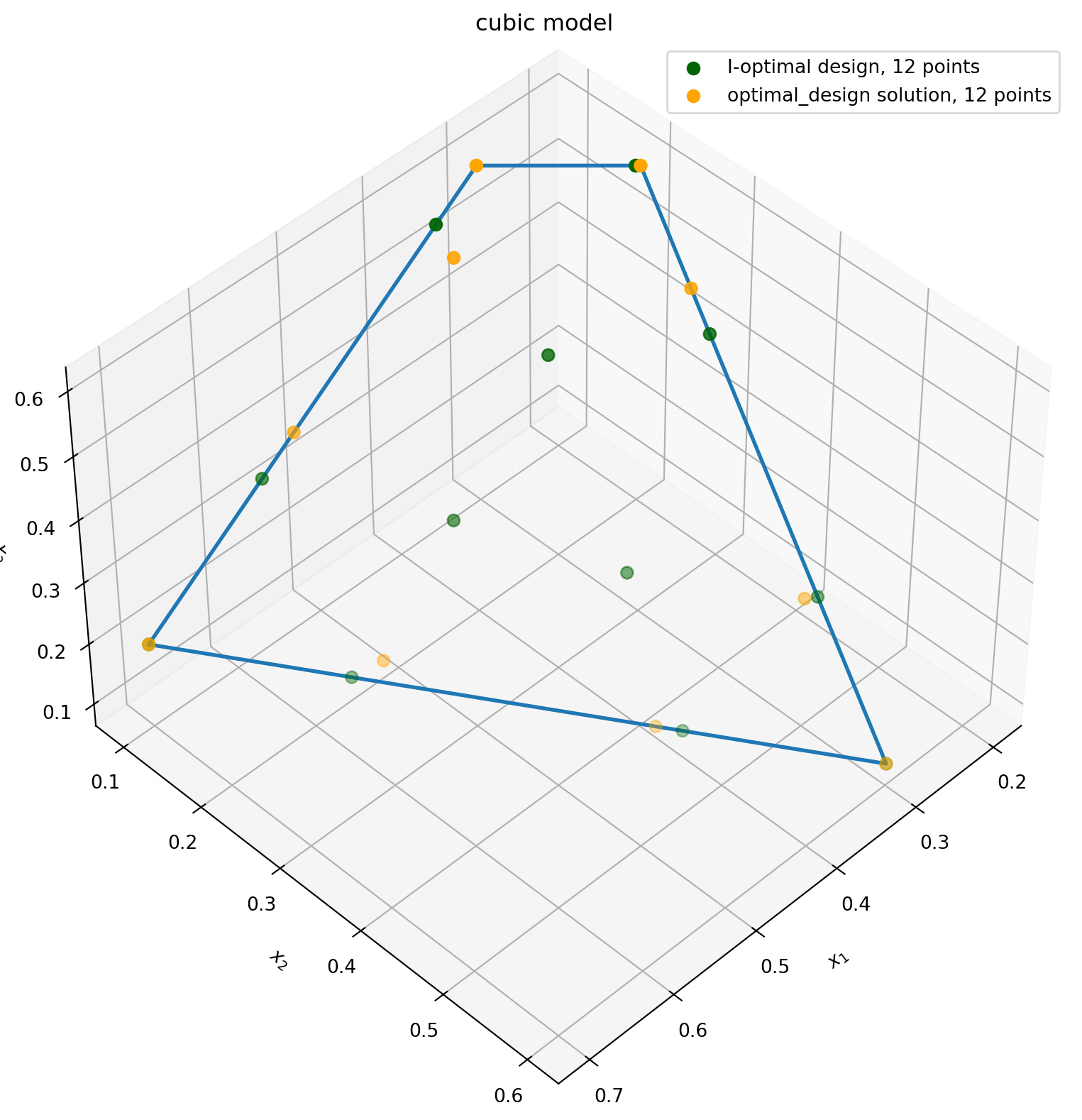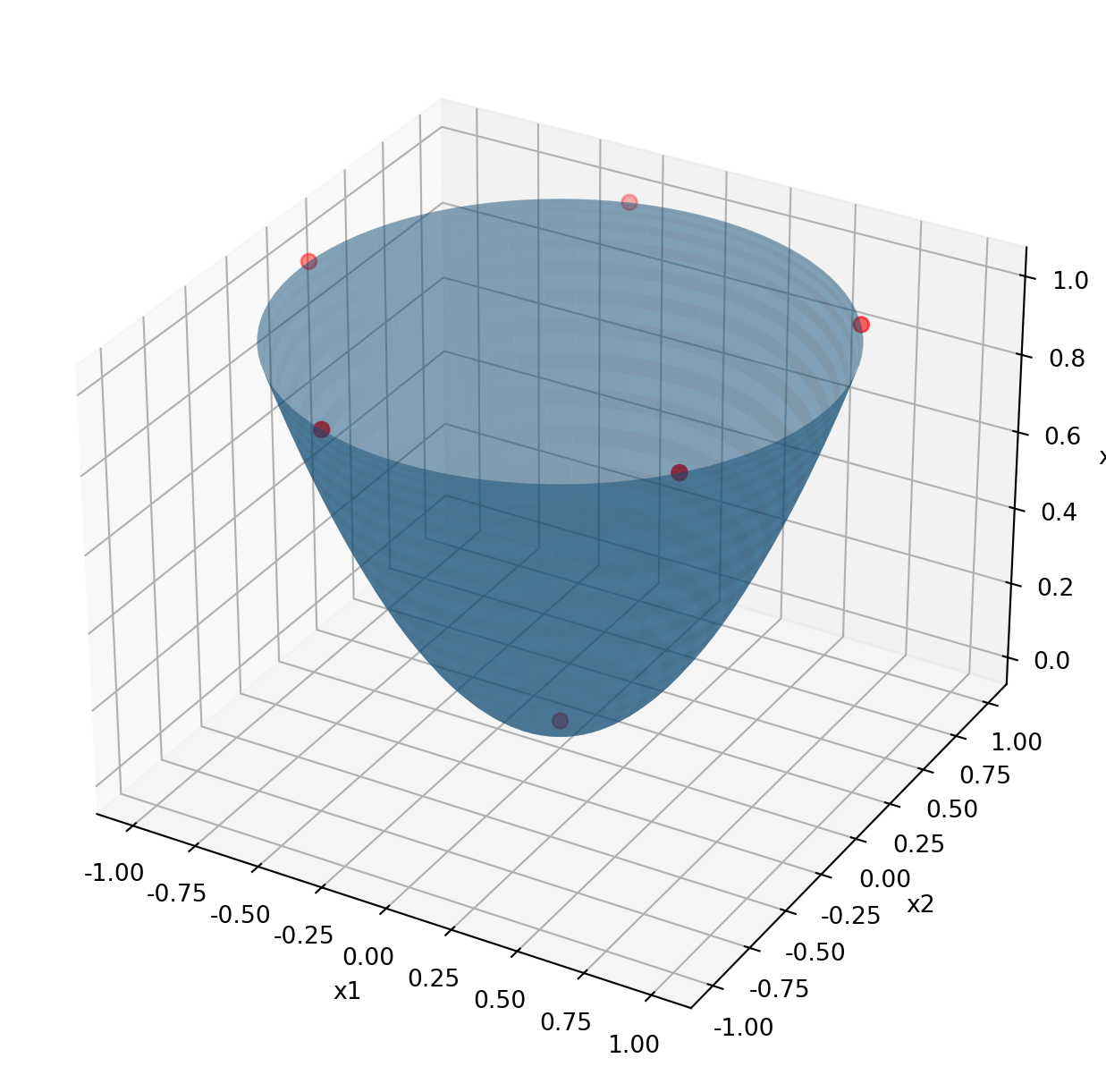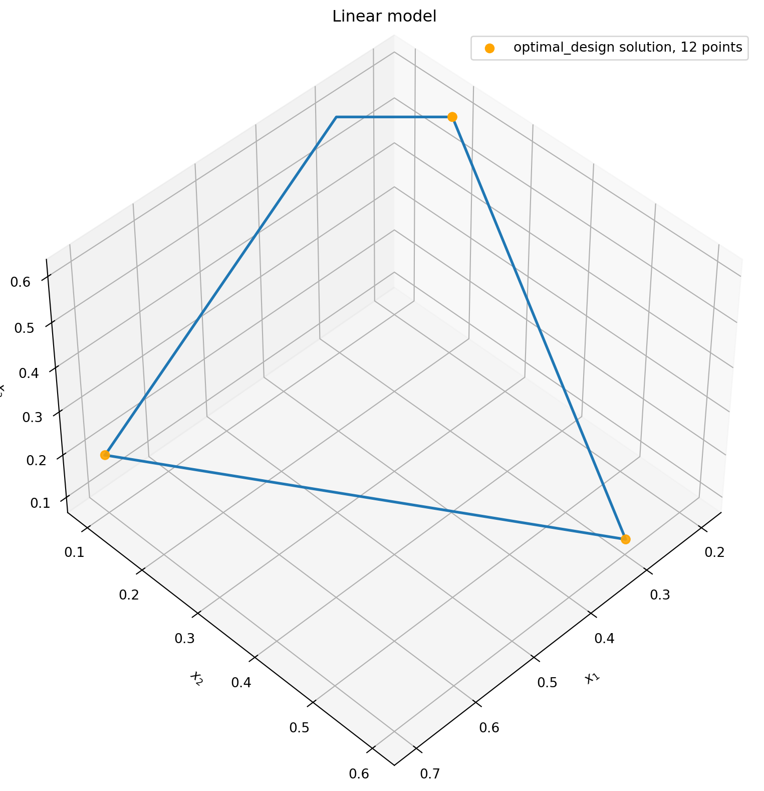 In the following example we have three design variables. We impose the constraint that all experiments have to be contained in the interior of a cone, which corresponds to the nonlinear inequality constraint \(\sqrt{x_1^2 + x_2^2} - x_3 \leq 0\). The optimization is done for a linear model and we will see that it places the points on the surface of the cone so as to maximize the distance between them (although this is not explicitly the objective of the optimization).
