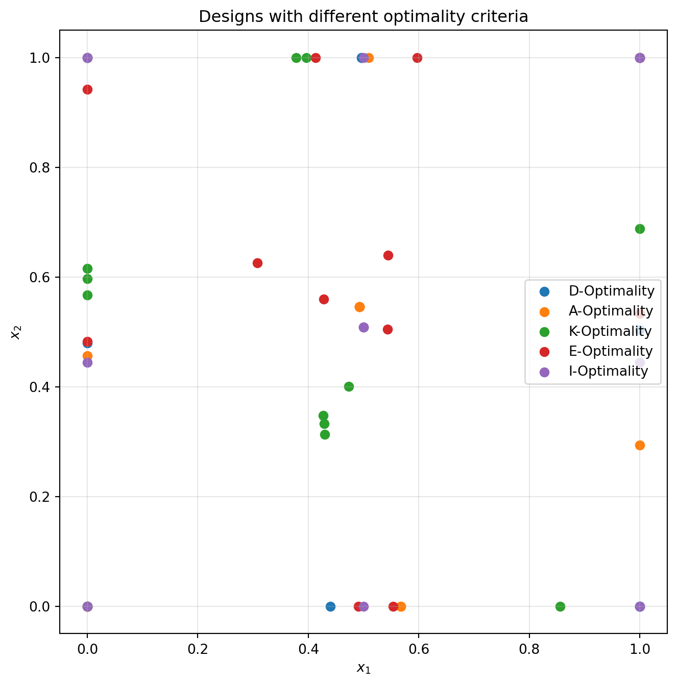 This tutorial notebook demonstrates the impact of different optimality-criteria for generating candidates using the DoE strategy for a two-dimensional fully-quadratic model.