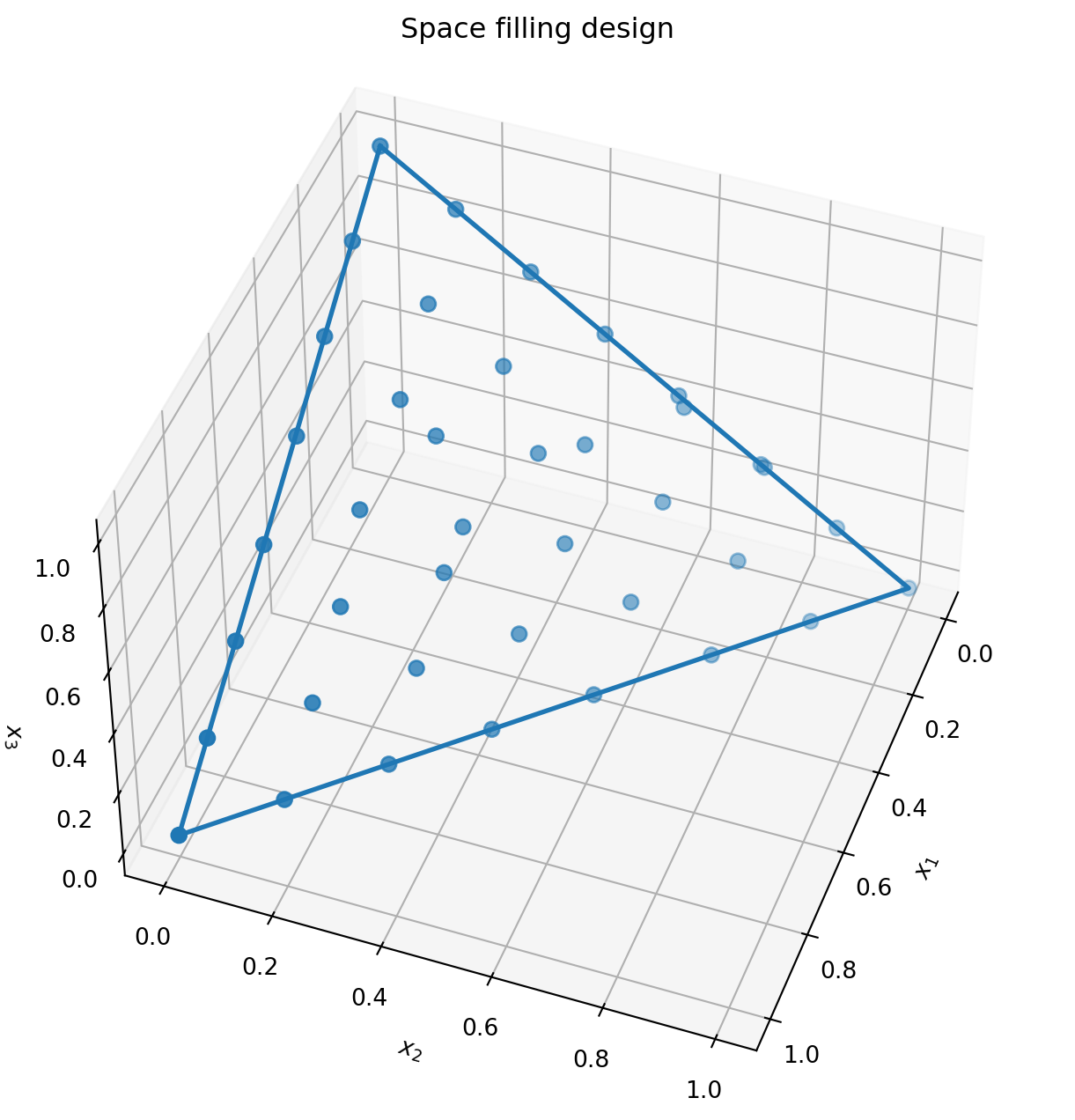 BoFire can also generate space filling designs, here it is show three dimensions and a simplex constraint.